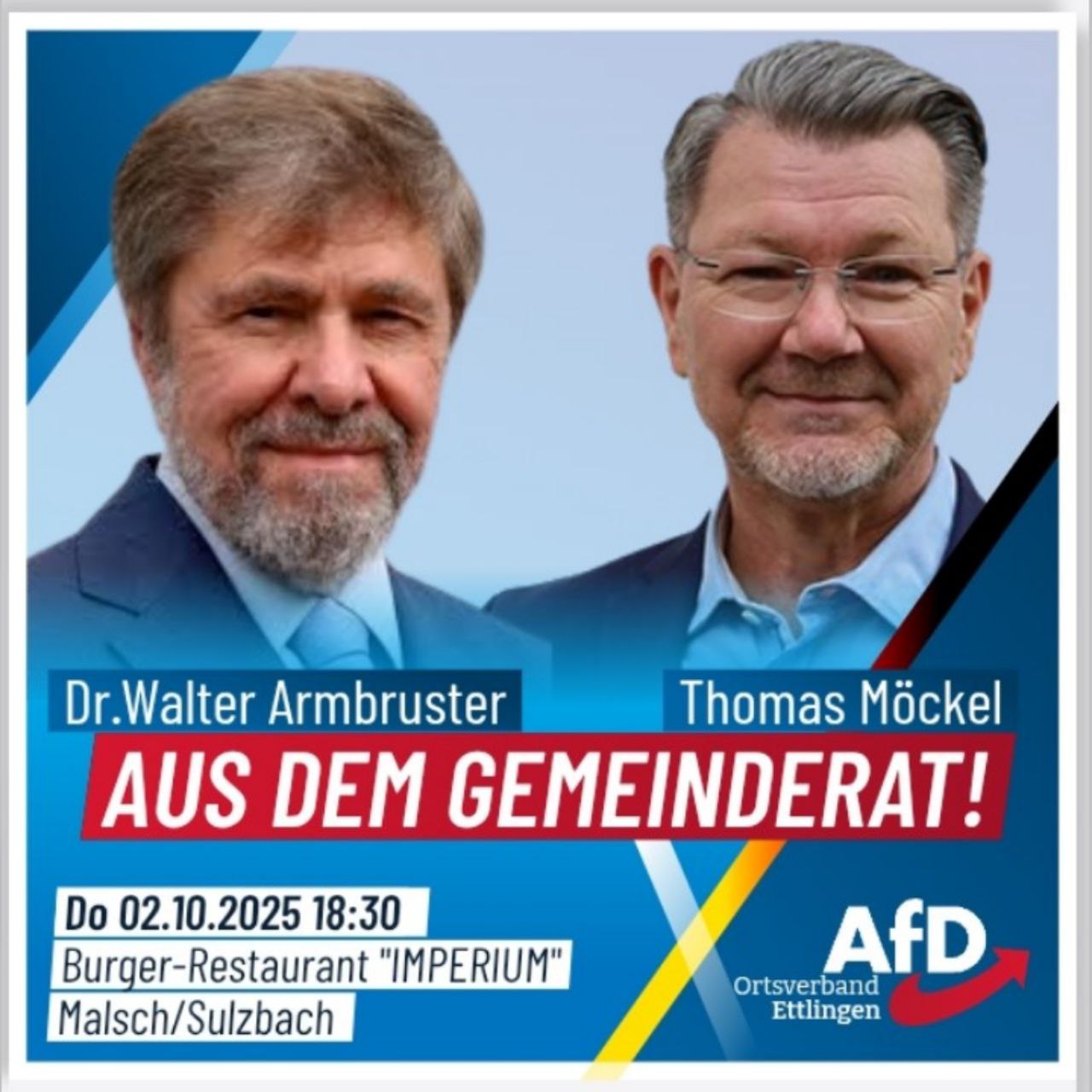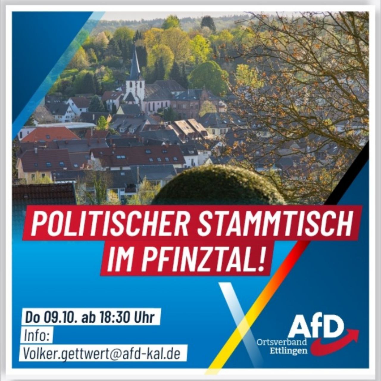 Unser Stammtisch des OV Ettlingen im Pfinztal bietet eine offene Plattform, um in entspannter Atmosphäre miteinander ins Gespräch zu kommen. Jeder ist willkommen, egal ob erfahren im politischen Diskurs oder neu in der Materie. Wir freuen uns auf interessante Gespräche und neue,frische Ideen. Wann: Do., 09.10. ab 18: 30 Uhr Wo: Info unter volker.gettwert@afd-kal.de
