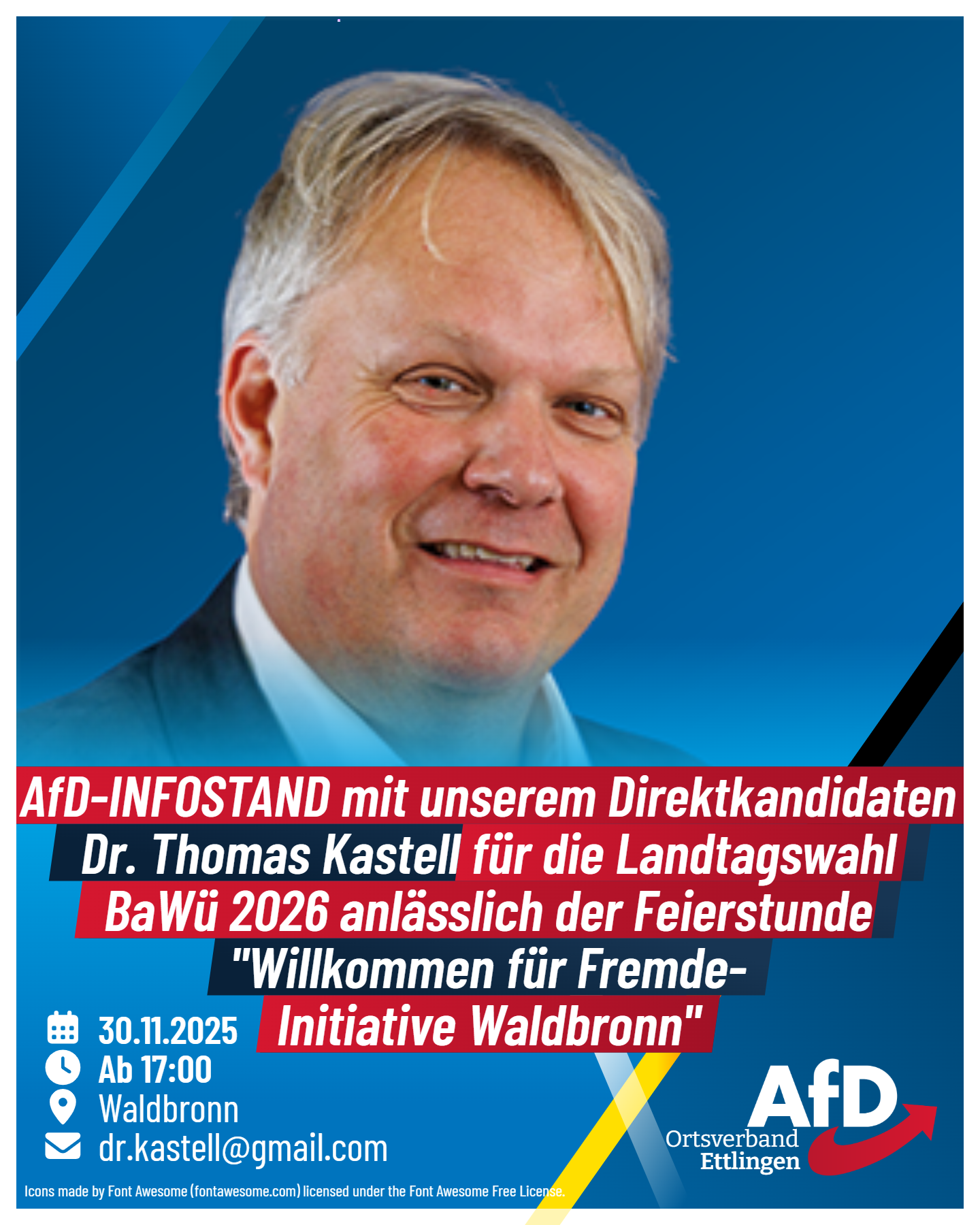 Waldbronn📍Liebe Freunde, am kommenden Sonntag, 30.11., wird in Waldbronn eine Feierstunde anlässlich des 10-jährigen Bestehens der Initiative "Willkommen für Fremde in Waldbronn" abgehalten. Grund genug für uns Präsenz zu zeigen! Bei Interesse meldet euch bitte unter dr.kastell@gmail.com. Freundliche Grüße Dr. Thomas Markus Kastell