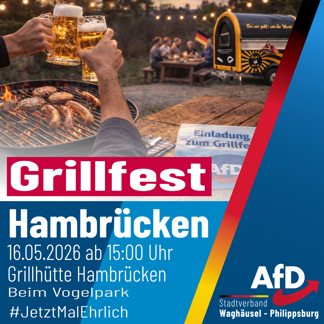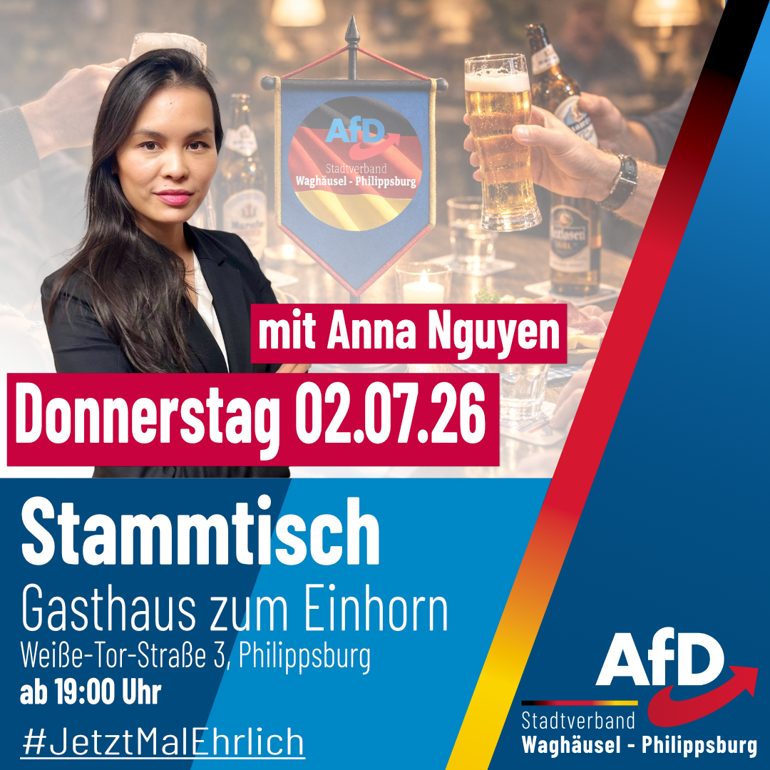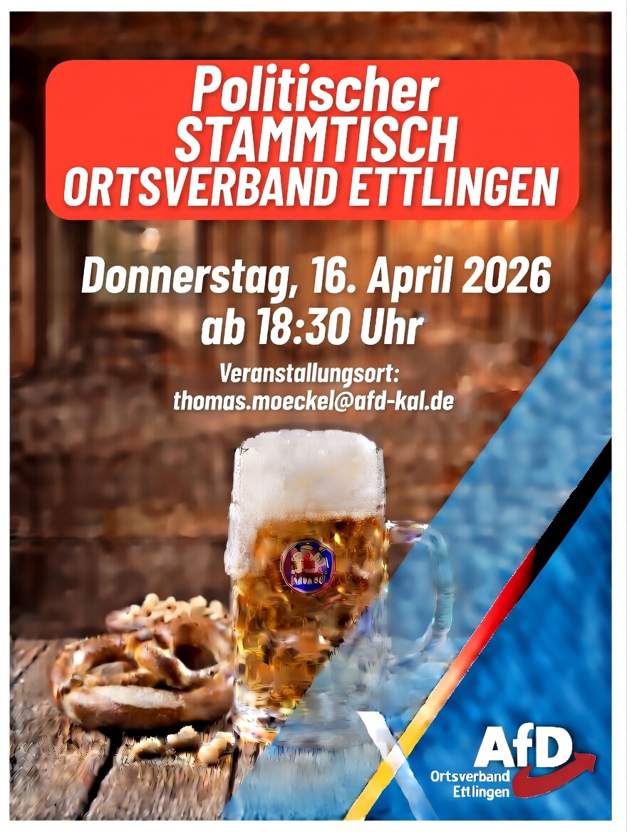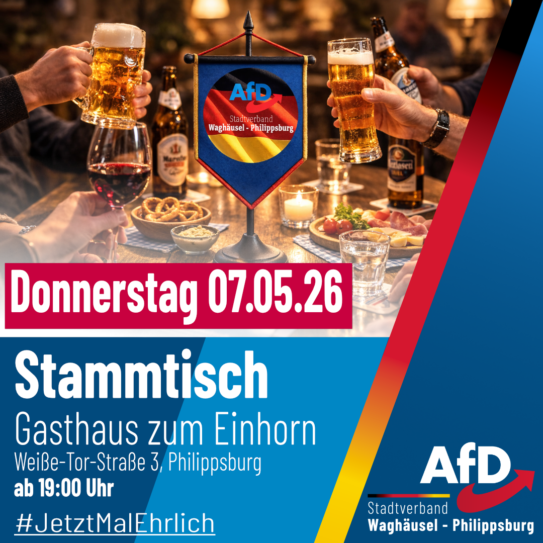 Hallo zusammen, wir möchten euch herzlich zu unserem nächsten Stammtisch einladen! In gemütlicher Runde wollen wir zusammenkommen, uns austauschen, lachen und einfach einen schönen Abend verbringen. Ob alte Bekannte oder neue Gesichter – alle sind herzlich willkommen! Wir freuen uns auf euch! Liebe Grüße, AfD Ortsverband Ettlingen