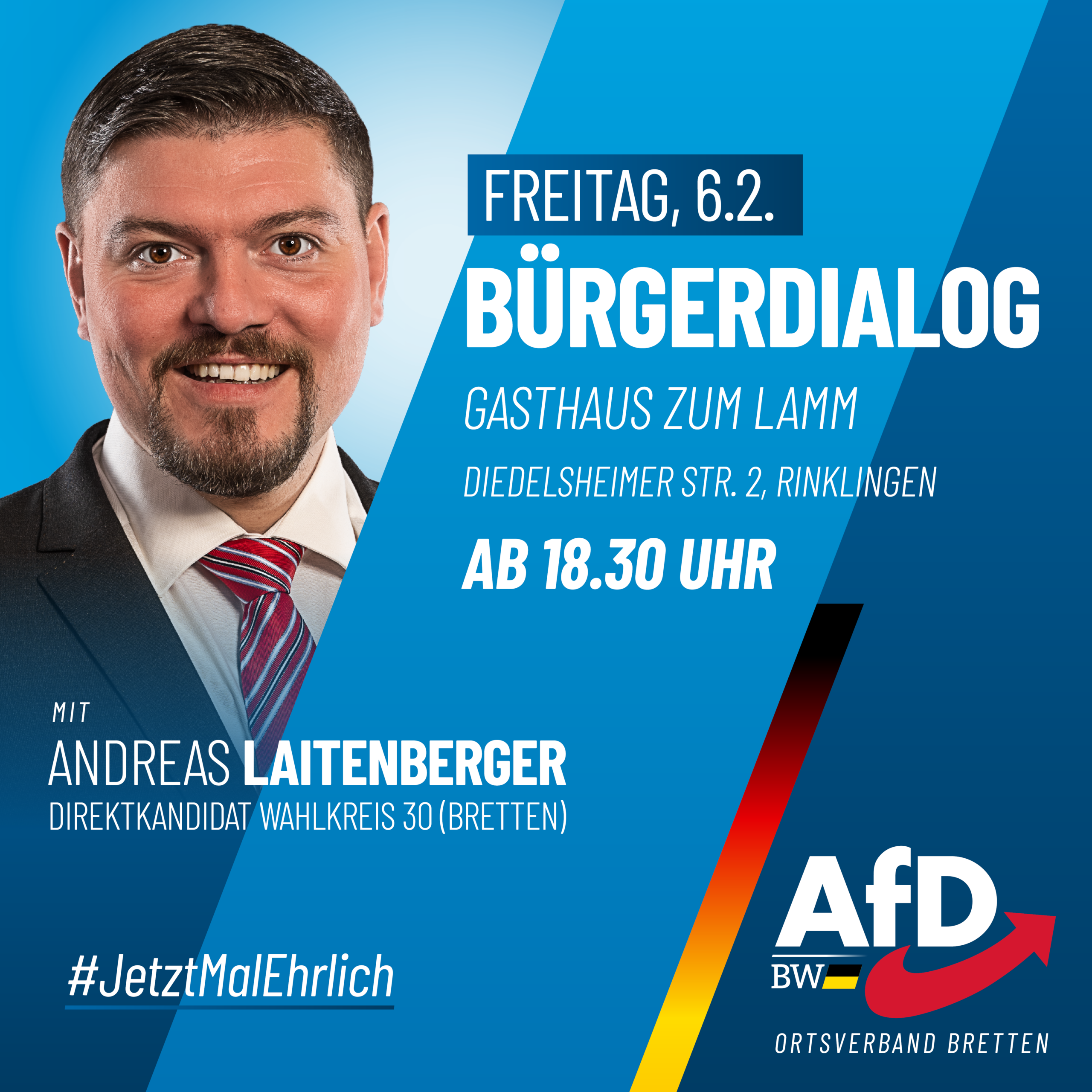 Im Rahmen der Landtagswahl am 8. März 2026 laden wir zum Bürgerdialog ein. Unser Direktkandidat Andreas Laitenberger steht vor Ort für Gespräche zur Verfügung und informiert über politische Positionen, Schwerpunkte und Ziele. Sie haben die Möglichkeit, Fragen zu stellen, Informationsmaterial mitzunehmen und direkt ins Gespräch zu kommen.