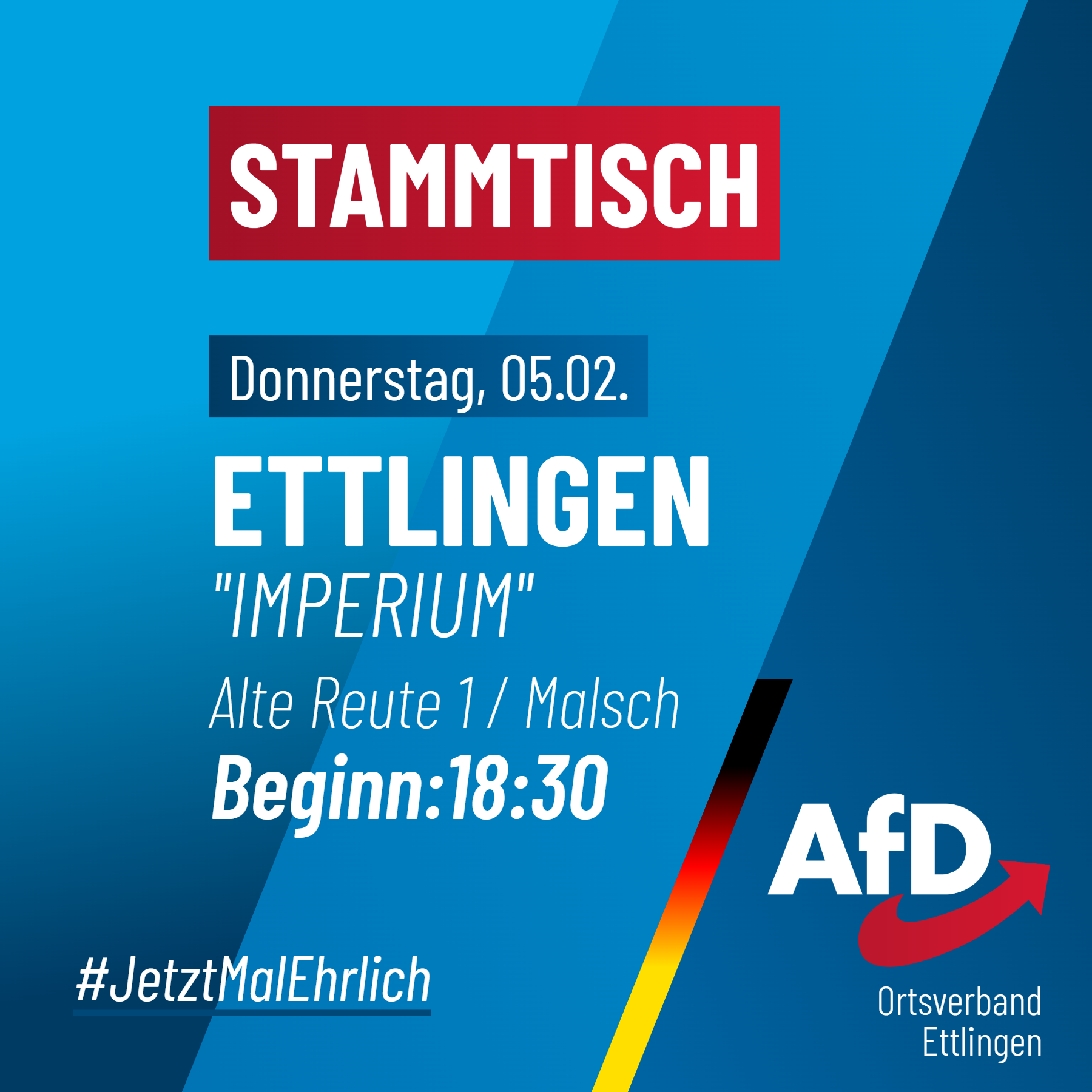 AfD Ettlingen lädt zum Stammtisch ein. Kommen Sie vorbei, um in entspannter Runde über aktuelle politische Themen zu diskutieren, Ideen auszutauschen. Wir freuen uns darauf auch neue Mitglieder näher kennenzulernen.